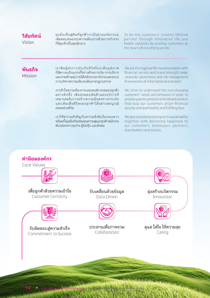 บริษัทมุ่งมั่นที่จะเป็นอันดับหนึ่งในการเป็นคู่คิดด้านการวางแผนชีวิตและสุขภาพ เน้นตอบโจทย์ทุกความเป็นคุณ (Personal) ในทุกช่วงของชีวิต (Life) เติมเต็มความสุข เพื่อให้คุณเป็นตัวคุณและรู้สึกดีที่สุดในรูปแบบของตัวคุณเอง แม้จะเป็นเรื่องของประกันก็ตาม
