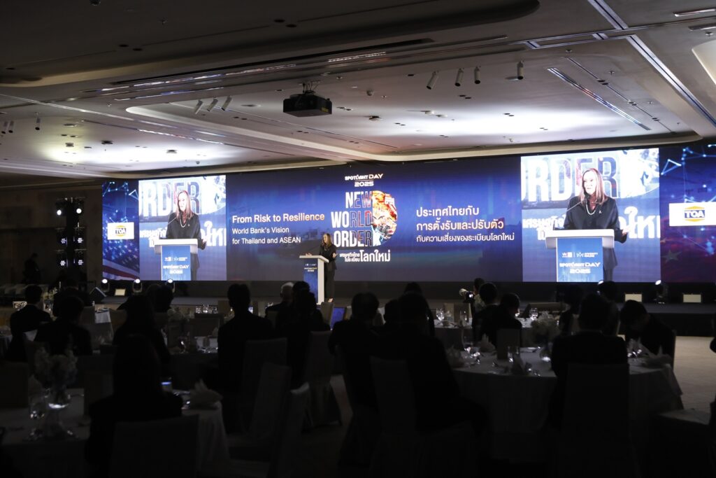 พร้อมกันนี้ยังมีตัวแทนจากองค์กรระหว่างประเทศ คุณเมลินดา กู้ด ผู้อำนวยการธนาคารโลกประจำประเทศไทยและประเทศเมียนมา ขึ้นกล่าวปาฐกถา “From Risk to Resilience: World Bank’s Vision for Thailand and ASEAN ประเทศไทยกับการตั้งรับและปรับตัวกับความเสี่ยงของระเบียบโลกใหม่”