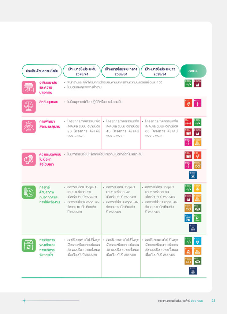 โดยเป็นบริษัทที่ให้ความสำคัญกับความรับผิดชอบต่อสังคมและสิ่งแวดล้อม ยึดแนวทางการเติบโตอย่างยั่งยืนที่สอดคล้องกับเป้าหมายการพัฒนาอย่างยั่งยืน (SDGs) มุ่งสร้างสมดุลระหว่างการขยายตัวของธุรกิจ และการสร้างผลกระทบเชิงบวกต่อสังคม เพื่อเสริมรากฐานการเติบโตที่มั่นคงในระยะยาว